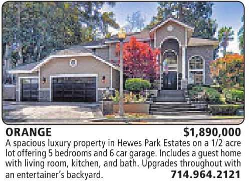 ORANGE $1,890,000 Aspacious luxury property inHewes ParkEstates on a1/2 acre lotoffering 5bedrooms and6car garage.Includes aguest home with living room, kitchen,and bath. Upgrades throughoutwith an entertainer’s backyard. 714.964.2121