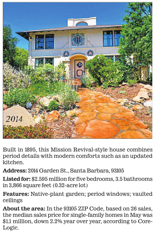 Built in 1895, this Mission Revival-style house combines period details with modern comforts such as an updated kitchen. Address: 2014 Garden St., Santa Barbara, 93105 Listed for: $2.595 million for five bedrooms, 3.5 bathrooms in 3,866 square feet (0.32-acre lot) Features: Native-plant garden; period windows; vaulted ceilings About the area: In the 93105 ZIP Code, based on 26 sales, the median sales price for single-family homes in May was $1.1 million, down 2.2% year over year, according to Core- Logic. See also