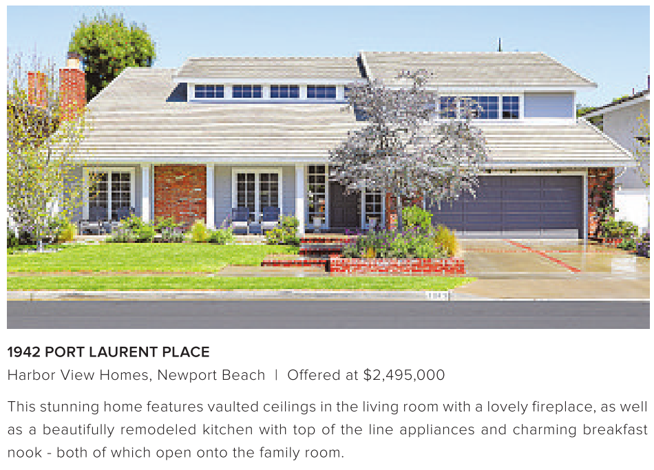 1942 PORT LAURENT PLACE Harbor View Homes, Newport Beach | Offered at $2,495,000 This stunning home features vaulted ceilings in the living room with a lovely fireplace, as well as a beautifully remodeled kitchen with top of the line appliances and charming breakfast nook - both of which open onto the family room.