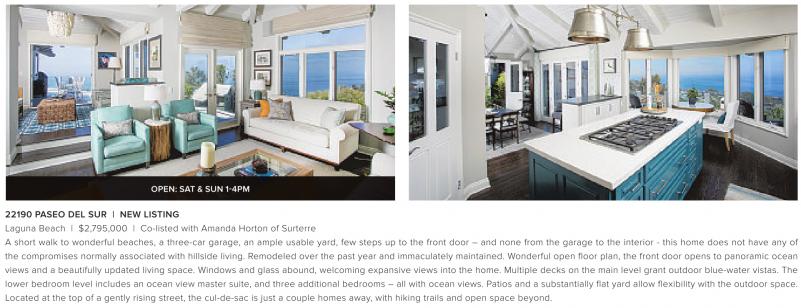 OPEN: SAT &SUN 1-4PM 22190 PASEO DEL SUR | NEW LISTING Laguna Beach | $2,795,000 | Co-listed with Amanda Horton of Surterre A short walk to wonderful beaches, a three-car garage, an ample usable yard, few steps up to the front door – and none from the garage to the interior - this home does not have any of the compromises normally associated with hillside living. Remodeled over the past year and immaculately maintained. Wonderful open floor plan, the front door opens to panoramic ocean views and a beautifully updated living space. Windows and glass abound, welcoming expansive views into the home. Multiple decks on the main level grant outdoor blue-water vistas. The lower bedroom level includes an ocean view master suite, and three additional bedrooms – all with ocean views. Patios and a substantially flat yard allow flexibility with the outdoor space. Located at the top of a gently rising street, the cul-de-sac is just a couple homes away, with hiking trails and open space beyond. See also