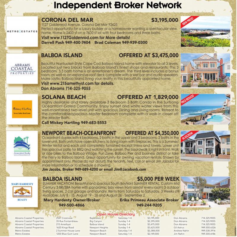 Abrams Coastal Properties 2541 Crestview Bayshores Saturday 1-4 $3,195,000 Don Abrams 714.325.9055 Abrams Coastal Properties 35Rue Fontainbleau Big Canyon Sunday 1-4 $2,395,000 Don Abrams 714.325.9055 Abrams Coastal Properties 215 Amethyst Balboa Island Sunday 1-4 $3,475,000 Don Abrams 714.325.9055 Abrams Coastal Properties 1620 Kings Road Newport Heights Sunday 1-4 $3,625,000 Gil Astruc 949.300.6326 Metro Estates 2 Summer House Lane Newport Beach Saturday 1-4 $2,388,000 Andrew Nahin 949.338.3916 Metro Estates 1200 Blue Gum Lane Newport Beach Saturday 1-4 $2,149,000 Jim Nahin 949.300.6186