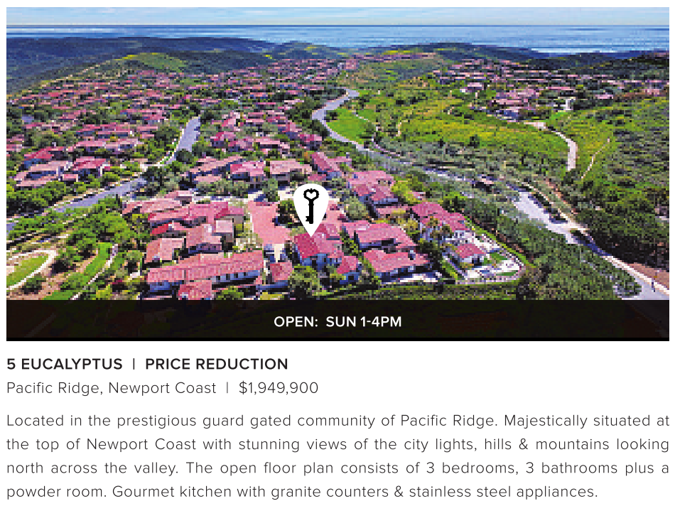 OPEN: SUN 1-4PM 5 EUCALYPTUS | PRICE REDUCTION Pacific Ridge, Newport Coast | $1,949,900 Located in the prestigious guard gated community of Pacific Ridge. Majestically situated at the top of Newport Coast with stunning views of the city lights, hills & mountains looking north across the valley. The open floor plan consists of 3 bedrooms, 3 bathrooms plus a powder room. Gourmet kitchen with granite counters & stainless steel appliances. See also