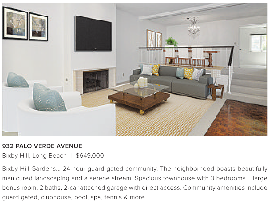 932 PALO VERDE AVENUE Bixby Hill, Long Beach | $649,000 Bixby Hill Gardens... 24-hour guard-gated community. The neighborhood boasts beautifully manicured landscaping and a serene stream. Spacious townhouse with 3 bedrooms + large bonus room, 2 baths, 2-car attached garage with direct access. Community amenities include guard gated, clubhouse, pool, spa, tennis & more.