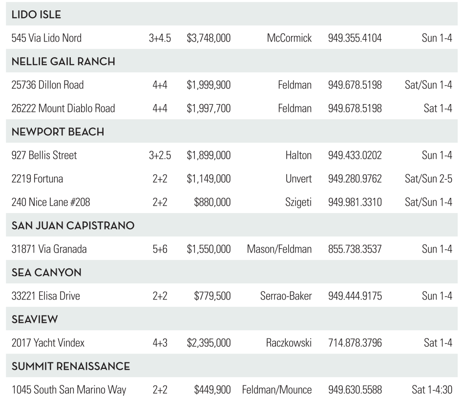 LIDO ISLE 545 ViaLido Nord 3+4.5 $3,748,000 McCormick 949.355.4104 Sun 1-4 NELLIE GAIL RANCH 25736 Dillon Road 4+4 $1,999,900 Feldman 949.678.5198 Sat/Sun 1-4 26222 Mount Diablo Road 4+4 $1,997,700 Feldman 949.678.5198 Sat 1-4 NEWPORTBEACH 927 Bellis Street 3+2.5 $1,899,000 Halton 949.433.0202 Sun 1-4 2219 Fortuna 2+2 $1,149,000 Unvert 949.280.9762 Sat/Sun 2-5 240 Nice Lane #208 2+2 $880,000 Szigeti 949.981.3310 Sat/Sun 1-4 SANJUANCAPISTRANO 31871 ViaGranada 5+6 $1,550,000 Mason/Feldman 855.738.3537 Sun 1-4 SEA CANYON 33221 Elisa Drive 2+2 $779,500 Serrao-Baker 949.444.9175 Sun 1-4 SEAVIEW 2017 Yacht Vindex 4+3 $2,395,000 Raczkowski 714.878.3796 Sat 1-4 SUMMIT RENAISSANCE 1045 South San Marino Way 2+2 $449,900 Feldman/Mounce 949.630.5588 Sat 1-4:30