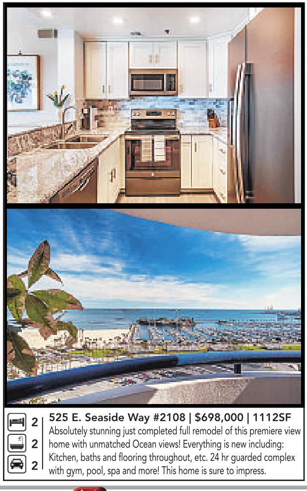 2 2 2 525 E. Seaside Way #2108 | $698,000 | 1112SF Absolutely stunning just completed full remodel of this premiere view home with unmatched Ocean views! Everything is new including: Kitchen, baths and flooring throughout, etc. 24 hr guarded complex with gym, pool, spa and more! This home is sure toimpress.