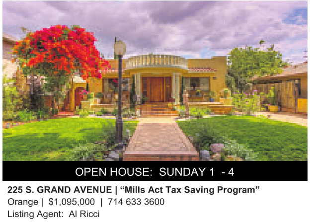 OPEN HOUSE: SUNDAY 1 - 4 225 S. GRAND AVENUE |“Mills Act Tax Saving Program” Orange | $1,095,000 | 714 633 3600 Listing Agent: AlRicci