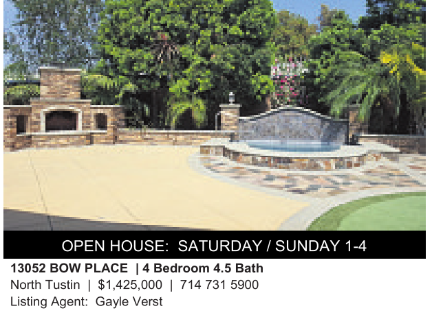OPEN HOUSE: SATURDAY / SUNDAY 1-4 13052 BOW PLACE | 4Bedroom 4.5 Bath North Tustin | $1,425,000 | 714 731 5900 Listing Agent: Gayle Verst