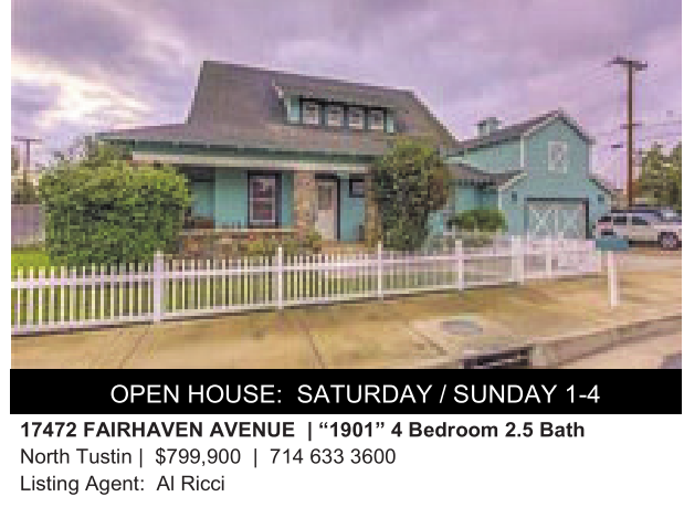 OPEN HOUSE: SATURDAY / SUNDAY 1-4 17472 FAIRHAVEN AVENUE |“1901” 4Bedroom 2.5 Bath North Tustin | $799,900 | 714 633 3600 Listing Agent: AlRicci