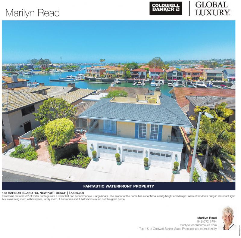 Marilyn Read FANTASTIC WATERFRONT PROPERTY 153 HARBOR ISLAND RD, NEWPORT BEACH | $7,450,000 This home features 70’ of water frontage with a dock that can accommodate 2 large boats. The interior of the home has exceptional ceiling height and design. Walls of windows bring in abundant light. A sunken living room with fireplace, family room, 4 bedrooms and 4 bathrooms round out this great home. Marilyn Read 949.632.2494 Marilyn.Read@camoves.com Top 1% of Coldwell Banker Sales Professionals Internationally See also