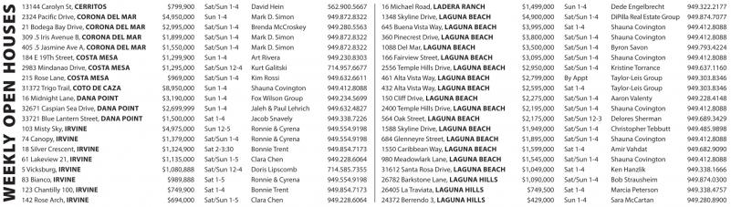 16 MichaelRoad, LADERARANCH $1,499,000 Sun 1-4 Dede Engelbrecht 949.322.2177 1348 Skyline Drive, LAGUNA BEACH $4,900,000 Sat/Sun 1-4 DiPilla Real EstateGroup 949.874.7077 645 Buena Vista Way, LAGUNA BEACH $3,995,000 Sat 1-4 Shauna Covington 949.412.8088 360 Pinecrest Drive, LAGUNA BEACH $3,800,000 Sat/Sun 1-4 Shauna Covington 949.412.8088 1088 DelMar, LAGUNA BEACH $3,500,000 Sat/Sun 1-4 Byron Savon 949.793.4224 166 Fairview Street, LAGUNA BEACH $3,095,000 Sat/Sun 1-4 Shauna Covington 949.412.8088 2556 Temple Hills Drive, LAGUNA BEACH $2,950,000 Sat/Sun 1-4 Kristine Torrance 949.637.1160 461 Alta Vista Way, LAGUNA BEACH $2,799,000 ByAppt Taylor-Leis Group 949.303.8346 432 Alta Vista Way, LAGUNA BEACH $2,595,000 Sat 1-4 Taylor-LeisGroup 949.303.8346 150 Cliff Drive, LAGUNA BEACH $2,275,000 Sat/Sun 1-4 Aaron Valenty 949.228.4148 2400 Temple HillsDrive, LAGUNA BEACH $2,195,000 Sat/Sun 1-4 Shauna Covington 949.412.8088 564 Oak Street, LAGUNA BEACH $2,175,000 Sat/Sun 12-3 Delores Sherman 949.689.3429 1588 Skyline Drive, LAGUNA BEACH $1,949,000 Sat/Sun1-4 Christopher Tebbutt 949.485.9898 684 Glenneyre Street, LAGUNA BEACH $1,895,000 Sat/Sun 1-4 Shauna Covington 949.412.8088 1550 Caribbean Way, LAGUNA BEACH $1,599,000 Sat 1-4 Amir Vahdat 949.682.9090 980Meadowlark Lane, LAGUNA BEACH $1,545,000 Sat/Sun 1-4 Shauna Covington 949.412.8088 31612Santa Rosa Drive, LAGUNA BEACH $1,049,000 Sat 1-4 Ken Hanzlik 949.338.1666 26782 Barkstone Lane, LAGUNA HILLS $1,090,000 Sat/Sun 1-4 BobStrausheim 949.874.0300 26405 La Traviata, LAGUNA HILLS $749,500 Sat 1-4 Marcia Peterson 949.338.4757 24372 Berrendo 3, LAGUNA HILLS $429,000 Sun 1-4 Sara McCartan 949.280.8900