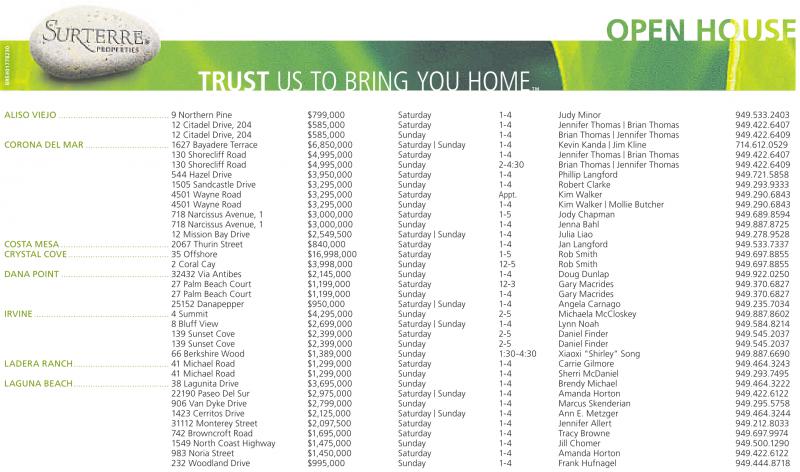 ALISO VIEJO ............................................. 9 Northern Pine $799,000 Saturday 1-4 Judy Minor 949.533.2403 12 Citadel Drive, 204 $585,000 Saturday 1-4 Jennifer Thomas | Brian Thomas 949.422.6407 12 Citadel Drive, 204 $585,000 Sunday 1-4 Brian Thomas | Jennifer Thomas 949.422.6409 CORONA DEL MAR .................................. 1627 Bayadere Terrace $6,850,000 Saturday | Sunday 1-4 Kevin Kanda | Jim Kline 714.612.0529 130 Shorecliff Road $4,995,000 Saturday 1-4 Jennifer Thomas | Brian Thomas 949.422.6407 130 Shorecliff Road $4,995,000 Sunday 2-4:30 Brian Thomas | Jennifer Thomas 949.422.6409 544 Hazel Drive $3,950,000 Saturday 1-4 Phillip Langford 949.721.5858 1505 Sandcastle Drive $3,295,000 Sunday 1-4 Robert Clarke 949.293.9333 4501 Wayne Road $3,295,000 Saturday Appt. Kim Walker 949.290.6843 4501 Wayne Road $3,295,000 Sunday 1-4 Kim Walker | Mollie Butcher 949.290.6843 718 Narcissus Avenue, 1 $3,000,000 Saturday 1-5 Jody Chapman 949.689.8594 718 Narcissus Avenue, 1 $3,000,000 Sunday 1-4 Jenna Bahl 949.887.8725 12 Mission Bay Drive $2,549,500 Saturday | Sunday 1-4 Julia Liao 949.278.9528 COSTA MESA ............................................ 2067 Thurin Street $840,000 Saturday 1-4 Jan Langford 949.533.7337 CRYSTAL COVE ......................................... 35 Offshore $16,998,000 Saturday 1-5 Rob Smith 949.697.8855 2 Coral Cay $3,998,000 Sunday 12-5 Rob Smith 949.697.8855 DANA POINT ............................................ 32432 Via Antibes $2,145,000 Sunday 1-4 Doug Dunlap 949.922.0250 27 Palm Beach Court $1,199,000 Saturday 12-3 Gary Macrides 949.370.6827 27 Palm Beach Court $1,199,000 Sunday 1-4 Gary Macrides 949.370.6827 25152 Danapepper $950,000 Saturday | Sunday 1-4 Angela Carnago 949.235.7034 IRVINE ....................................................... 4 Summit $4,295,000 Sunday 2-5 Michaela McCloskey 949.887.8602 8 Bluff View $2,699,000 Saturday | Sunday 1-4 Lynn Noah 949.584.8214 139 Sunset Cove $2,399,000 Saturday 2-5 Daniel Finder 949.545.2037 139 Sunset Cove $2,399,000 Sunday 2-5 Daniel Finder 949.545.2037 66 Berkshire Wood $1,389,000 Sunday 1:30-4:30 Xiaoxi "Shirley" Song 949.887.6690 LADERA RANCH....................................... 41 Michael Road $1,299,000 Saturday 1-4 Carrie Gilmore 949.464.3243 41 Michael Road $1,299,000 Sunday 1-4 Sherri McDaniel 949.293.7495 LAGUNA BEACH....................................... 38 Lagunita Drive $3,695,000 Sunday 1-4 Brendy Michael 949.464.3222 22190 Paseo Del Sur $2,975,000 Saturday | Sunday 1-4 Amanda Horton 949.422.6122 906 Van Dyke Drive $2,799,000 Sunday 1-4 Marcus Skenderian 949.295.5758 1423 Cerritos Drive $2,125,000 Saturday | Sunday 1-4 Ann E. Metzger 949.464.3244 31112 Monterey Street $2,097,500 Saturday 1-4 Jennifer Allert 949.212.8033 742 Browncroft Road $1,695,000 Saturday 1-4 Tracy Browne 949.697.9974 1549 North Coast Highway $1,475,000 Sunday 1-4 Jill Chomer 949.500.1290 983 Noria Street $1,450,000 Saturday 1-4 Amanda Horton 949.422.6122 232 Woodland Drive $995,000 Sunday 1-4 Frank Hufnagel 949.444.8718