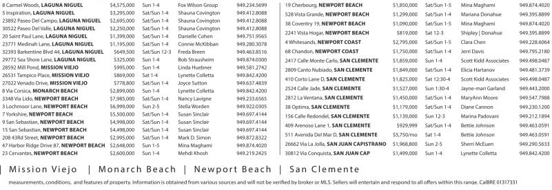 8Carmel Woods, LAGUNA NIGUEL $4,575,000 Sun 1-4 FoxWilson Group 949.234.5699 5Inspiration, LAGUNA NIGUEL $3,295,000 Sat/Sun 1-4 Shauna Covington 949.412.8088 23892 PaseoDel Campo, LAGUNA NIGUEL $2,695,000 Sat/Sun 1-4 Shauna Covington 949.412.8088 30522 PaseoDel Valle, LAGUNA NIGUEL $2,250,000 Sat/Sun 1-4 Shauna Covington 949.412.8088 20 Saint Paul Lane, LAGUNA NIGUEL $1,399,000 Sat/Sun 1-4 Danielle Cohen 949.751.9565 23771 Medinah Lane, LAGUNA NIGUEL $1,195,000 Sat/Sun 1-4 Connie McKibban 949.280.3078 32393 Barkentine Blvd44, LAGUNA NIGUEL $649,500 Sat/Sun 12-3 Freda Breen 949.463.8516 29772 SeaShoreLane, LAGUNA NIGUEL $325,000 Sun 1-4 Bob Strausheim 949.874.0300 28592 Mill Pond, MISSION VIEJO $995,000 Sun 1-4 Linda Huebner 949.581.2742 26531TampicoPlace, MISSION VIEJO $869,000 Sat 1-4 LynetteColletta 949.842.4200 27022 Venado Drive, MISSION VIEJO $778,800 Sat/Sun 1-4 JoyceSutton 949.637.4839 8Via Corsica, MONARCH BEACH $2,899,000 Sun 1-4 LynetteColletta 949.842.4200 3348 ViaLido, NEWPORT BEACH $7,985,000 Sat/Sun 1-4 NancyLavigne 949.233.6565 3Lochmoor Lane, NEWPORT BEACH $6,999,000 Sun2-5 Stella Worden 949.922.0305 7Yorkshire, NEWPORT BEACH $5,500,000 Sat/Sun 1-4 Susan Sinclair 949.697.4144 9San Sebastian, NEWPORT BEACH $4,998,000 Sat/Sun 1-4 Susan Sinclair 949.697.4144 15 San Sebastian, NEWPORT BEACH $4,498,000 Sat/Sun 1-4 Susan Sinclair 949.697.4144 208 43Rd Street, NEWPORT BEACH $2,995,000 Sat/Sun 1-4 Mark D. Simon 949.872.8322 47 Harbor Ridge Drive87, NEWPORT BEACH $2,648,000 Sun 1-5 Mina Maghami 949.874.4020 23 Cervantes, NEWPORT BEACH $2,600,000 Sun 1-4 Mehdi Khosh 949.219.2425 | Mission Viejo | Monarch Beach | Newpor t Beach | San Clemente