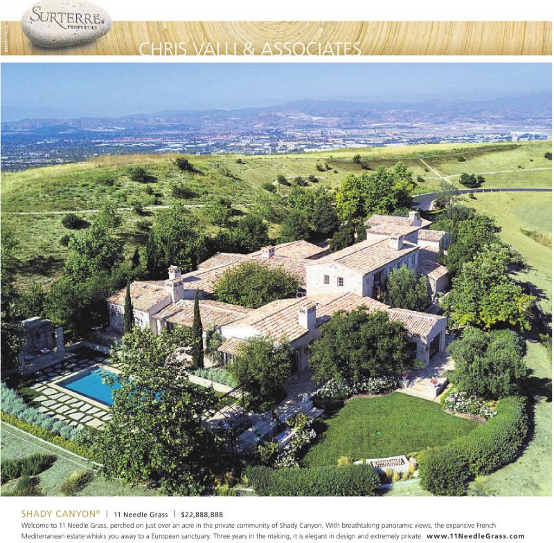 CHRIS VALLI & ASSOCIATES SHADY CANYON ® | 11 Needle Grass | $22,888,888 Welcome to 11 Needle Grass, perched on just over an acre in the private community of Shady Canyon. With breathtaking panoramic views, the expansive French Mediterranean estate whisks you away to a European sanctuary. Three years in the making, it is elegant in design and extremely private. www.11NeedleGrass.com See also