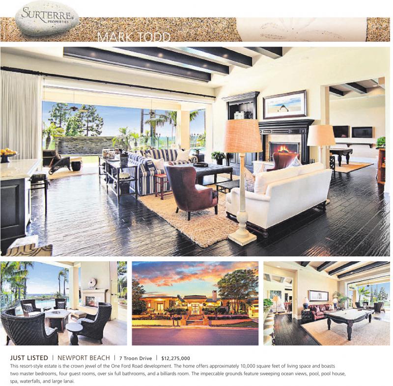 MARK TODD JUST LISTED | NEWPORT BEACH | 7 Troon Drive | $12,275,000 This resort-style estate is the crown jewel of the One Ford Road development. The home offers approximately 10,000 square feet of living space and boasts two master bedrooms, four guest rooms, over six full bathrooms, and a billiards room. The impeccable grounds feature sweeping ocean views, pool, pool house, spa, waterfalls, and large lanai.