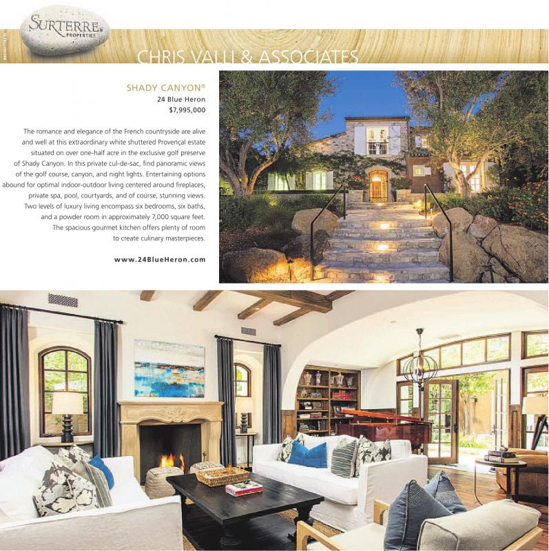 CHRIS VALLI & ASSOCIATES SHADY CANYON ® 24 Blue Heron $7,995,000 The romance and elegance of the French countryside are alive and well at this extraordinary white shuttered Provençal estate situated on over one-half acre in the exclusive golf preserve of Shady Canyon. In this private cul-de-sac, find panoramic views of the golf course, canyon, and night lights. Entertaining options abound for optimal indoor-outdoor living centered around fireplaces, private spa, pool, courtyards, and of course, stunning views. Two levels of luxury living encompass six bedrooms, six baths, and a powder room in approximately 7,000 square feet. The spacious gourmet kitchen offers plenty of room to create culinary masterpieces. www.24BlueHeron.com See also