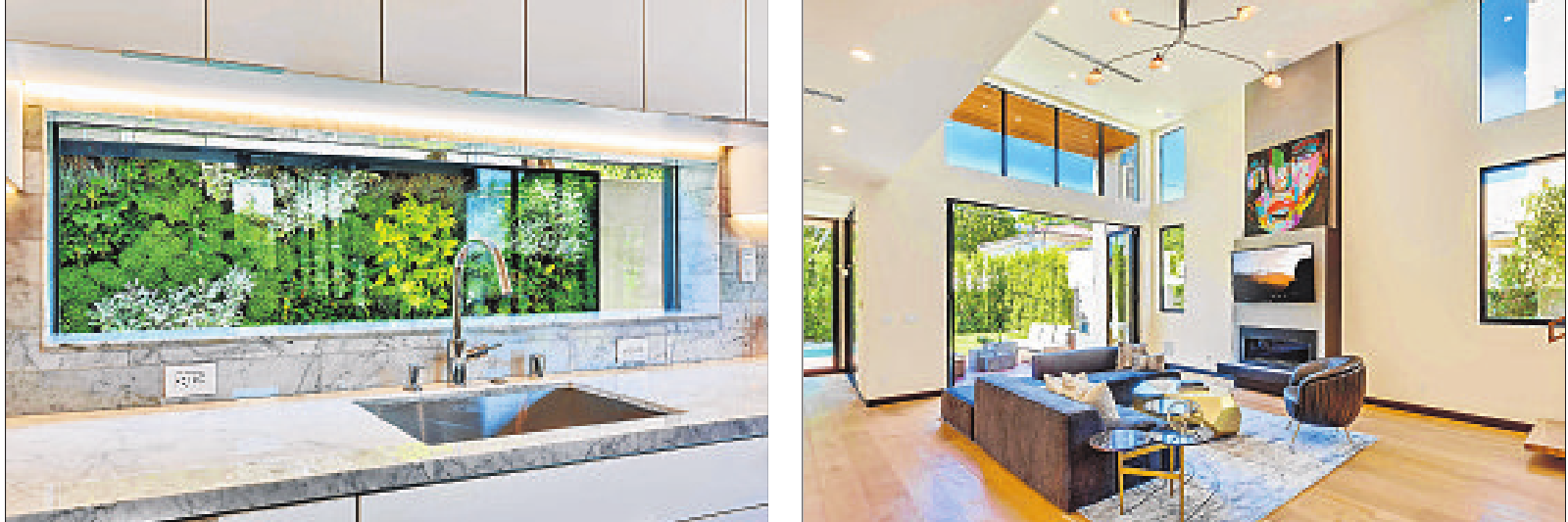In the kitchen, a wide rectangular window takes in an outdoor living green wall to brighten the living space.
