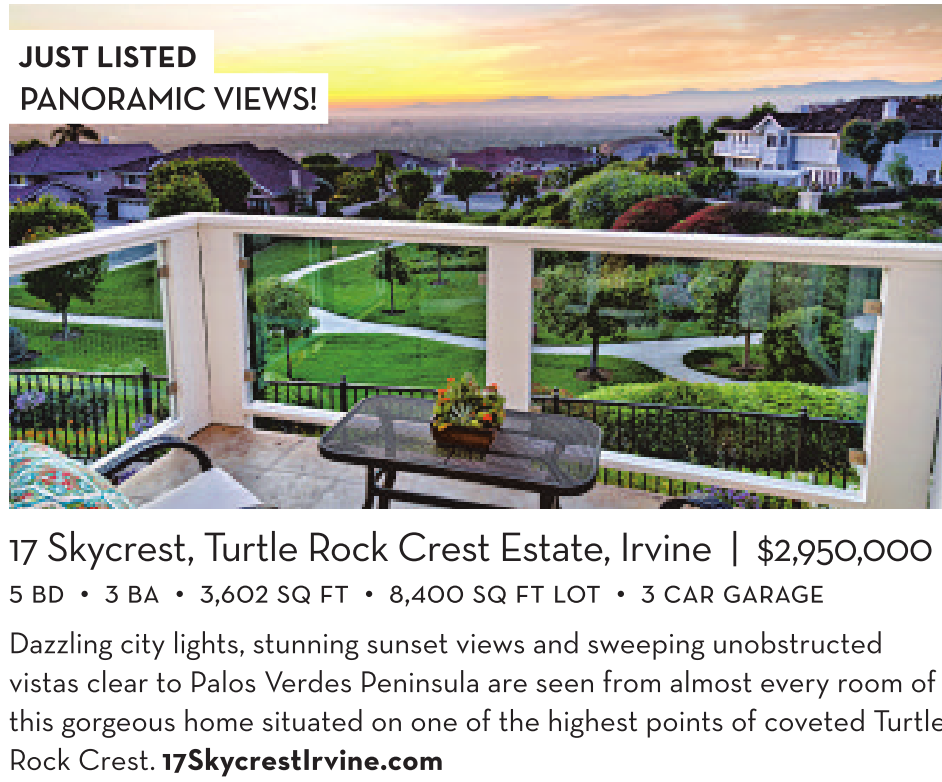 JUST LISTED PANORAMIC VIEWS! 17 Skycrest, Turtle Rock Crest Estate, Irvine | $2,950,000 5 BD • 3 BA • 3,602 SQ FT • 8,400 SQ FT LOT • 3 CAR GARAGE Dazzling city lights, stunning sunset views and sweeping unobstructed vistas clear to Palos Verdes Peninsula are seen from almost every room of this gorgeous home situated on one of the highest points of coveted Turtle Rock Crest. 17SkycrestIrvine.com See also