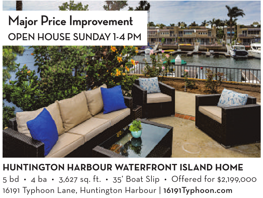 HUNTINGTON HARBOUR WATERFRONT ISLAND HOME 5 bd • 4 ba • 3,627 sq. ft. • 35’ Boat Slip • Offered for $2,199,000 16191 Typhoon Lane, Huntington Harbour | 16191Typhoon.com
