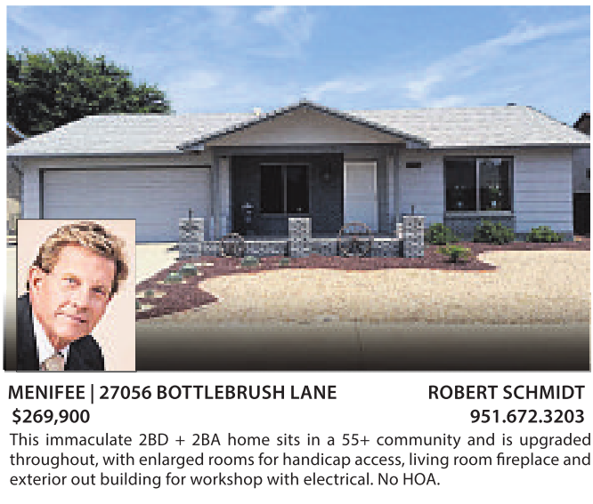 MENIFEE |27056 BOTTLEBRUSH LANE $269,900 951.672.3203 This immaculate 2BD + 2BA home sits in a 55+ community and is upgraded throughout, with enlarged rooms forhandicapaccess,living room fireplaceand exterior out building forworkshop with electrical.NoHOA. ROBERT SCHMIDT
