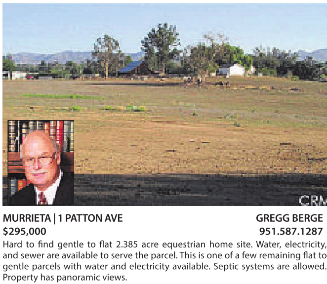 MURRIETA|1PATTONAVE GREGG BERGE $295,000 951.587.1287 Hard to find gentle to flat 2.385 acre equestrian home site. Water, electricity, and sewer areavailable to serve the parcel. This is one of afew remaining flat to gentle parcels with water and electricity available. Septic systems are allowed. Property has panoramic views.
