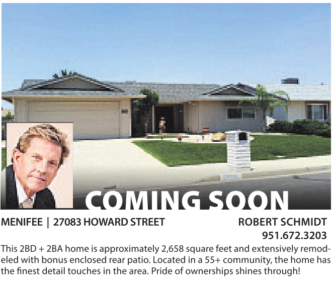 COMING SOON MENIFEE | 27083 HOWARDSTREET ROBERT SCHMIDT 951.672.3203 This 2BD +2BA home is approximately 2,658 squarefeet and extensivelyremodeled with bonus enclosed rear patio. Located in a55+ community, the home has the finest detail touches in the area. Pride of ownershipsshines through! See also