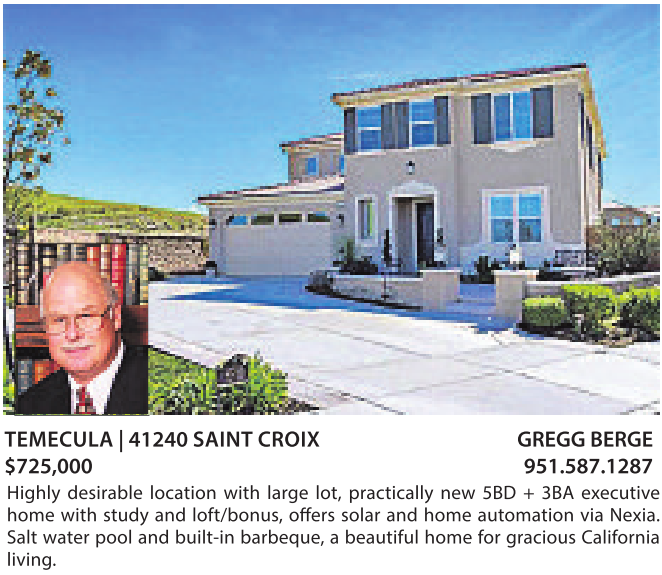 TEMECULA |41240 SAINT CROIX GREGG BERGE $725,000 951.587.1287 Highly desirable location with large lot, practically new 5BD + 3BA executive home with study and loft/bonus, offers solar and home automation via Nexia. Salt water pool and built-in barbeque, abeautiful home for gracious California living.