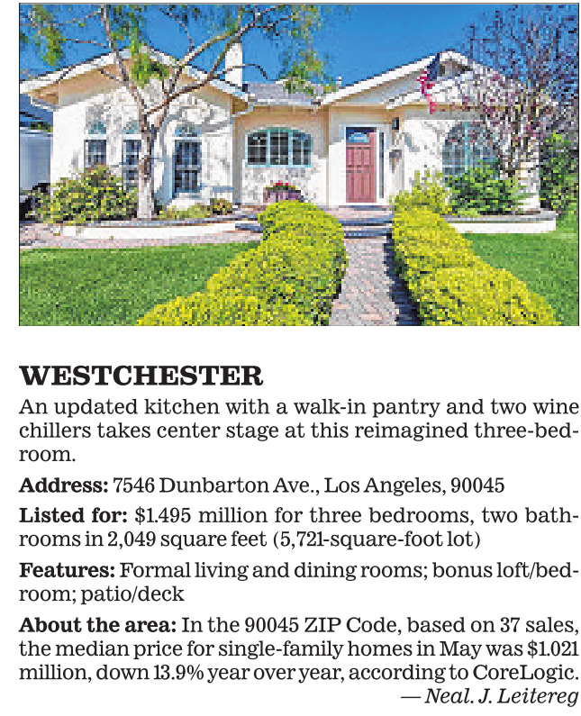 WESTCHESTER An updated kitchen with a walk-in pantry and two wine chillers takes center stage at this reimagined three-bedroom. Address: 7546 Dunbarton Ave., Los Angeles, 90045 Listed for: $1.495 million for three bedrooms, two bathrooms in 2,049 square feet (5,721-square-foot lot) Features: Formal living and dining rooms; bonus loft/bedroom; patio/deck About the area: In the 90045 ZIP Code, based on 37 sales, the median price for single-family homes in May was $1.021 million, down13.9% year over year, according to CoreLogic. —Neal. J. Leitereg