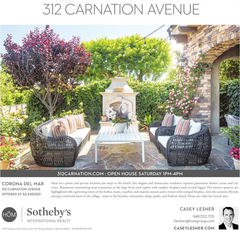 312 CARNATION AVENUE 312CARNATION.COM : OPEN HOUSE SATURDAY 1PM-4PM CORONA DEL MAR 312 CARNATION AVENUE OFFERED AT: $3,549,000 Sited on a prime and private location just steps to the beach, this elegant and immaculate residence captures panoramic harbor, ocean and city views. Bounteous entertaining areas commence at the large front yard replete with outdoor fireplace and covered loggia. The owner’s quarters are highlighted with captivating views of the harbor, boats, coastline and majestic sunsets and a retreat with tranquil fireplace. Join the exclusive lifestyle among a restricted street in the village - steps to the beaches, restaurants, shops, parks, and Fashion Island. Please see video for virtual tour. CASEY LESHER 949.702.7211 clesher@homgroup.com 1200 Newport Center Drive, Suite 100, Newport Beach, California 92660 | HOMGROUP.COM CASEYLESHER.COM