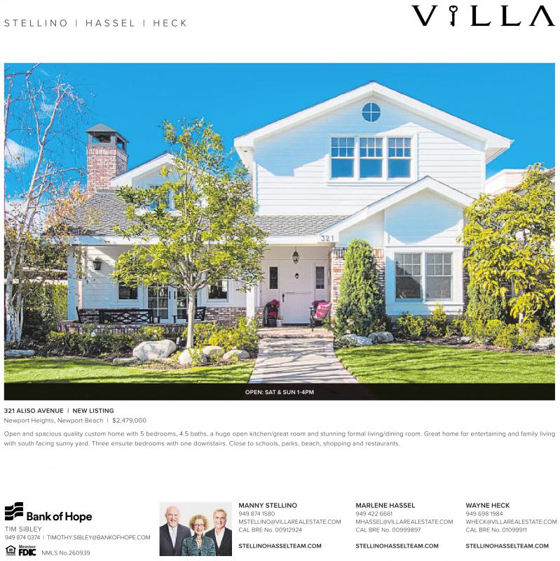 S T E L L I N O | H A S S E L | H E C K OPEN: SAT &SUN 1-4PM 321 ALISO AVENUE | NEW LISTING Newport Heights, Newport Beach | $2,479,000 Open and spacious quality custom home with 5 bedrooms, 4.5 baths, a huge open kitchen/great room and stunning formal living/dining room. Great home for entertaining and family living with south facing sunny yard. Three ensuite bedrooms with one downstairs. Close to schools, parks, beach, shopping and restaurants. TIM SIBLEY 949874 0374 | TIMOTHY.SIBLEY@BANKOFHOPE.COM NMLS No.260939 MANNY STELLINO 949 874 1580 MSTELLINO@VILLAREALESTATE.COM CAL BRE No. 00912924 STELLINOHASSELTEAM.COM MARLENE HASSEL 949 422 6661 MHASSEL@VILLAREALESTATE.COM CAL BRE No. 00999897 STELLINOHASSELTEAM.COM WAYNE HECK 949 698 1984 WHECK@VILLAREALESTATE.COM CAL BRE No. 01099911 STELLINOHASSELTEAM.COM
