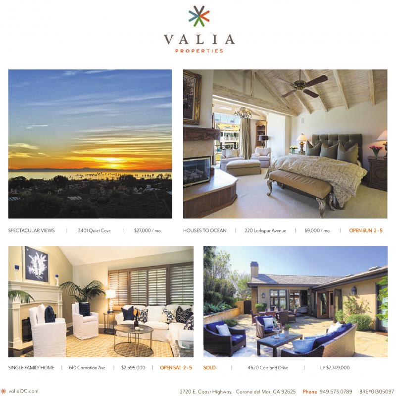 SPECTACULAR VIEWS | 3401 Quiet Cove | $27,000 /mo. HOUSES TO OCEAN | 220 Larkspur Avenue | $9,000 /mo. | OPEN SUN 2-5 SINGLE FAMILYHOME | 610 Carnation Ave. | $2,595,000 | OPEN SAT 2-5 SOLD | 4620 Cortland Drive | LP $2,749,000 valiaOC.com 2720 E. Coast Highway, Corona del Mar, CA 92625 Phone 949.673.0789 BRE#01305097