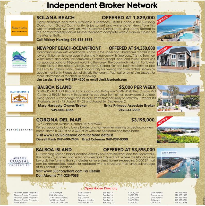 Abrams Coastal Properties 215 Amethyst Balboa Island Sunday 1-4 $3,475,000 Don Abrams 714.325.9055 Abrams Coastal Properties 2541 Crestview Bayshores Sunday 1-4 $3,195,000 Don Abrams 714.325.9055 Abrams Coastal Properties 35Rue Fontainbleau Big Canyon Sunday 1-4 $2,395,000 Don Abrams 714.325.9055 Abrams Coastal Properties 1620 Kings Road Newport Heights Sunday 1-4 $3,495,000 Gil Astruc 949.300.6326 Metro Estates 1200 Blue Gum Lane Newport Beach Saturday 1-4 $2,149,000 Jim Nahin 949.300.6186
