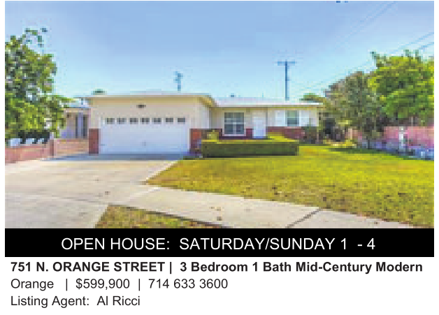 OPEN HOUSE: SATURDAY/SUNDAY 1 - 4 751 N. ORANGE STREET | 3 Bedroom 1Bath Mid-Century Modern Orange | $599,900 | 714 633 3600 Listing Agent: AlRicci