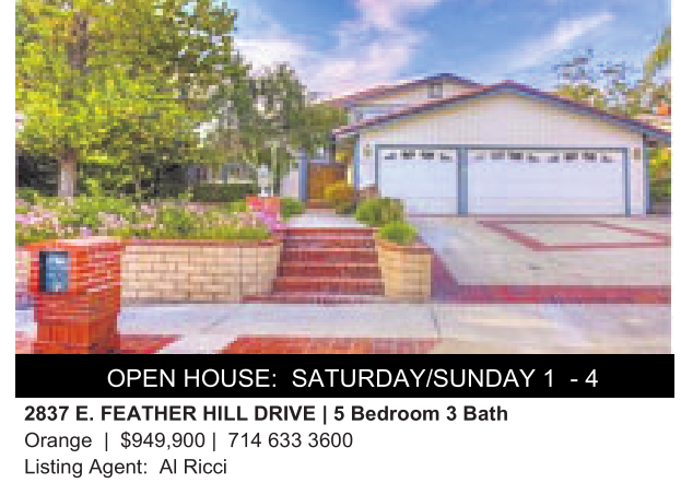 OPEN HOUSE: SATURDAY/SUNDAY 1 - 4 2837 E.FEATHER HILL DRIVE |5Bedroom 3Bath Orange | $949,900 | 714 633 3600 Listing Agent: AlRicci