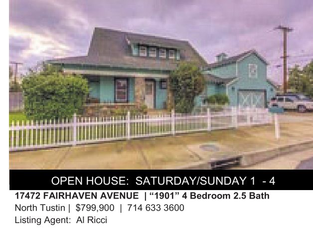 OPEN HOUSE: SATURDAY/SUNDAY 1 - 4 17472 FAIRHAVEN AVENUE |“1901” 4Bedroom 2.5 Bath North Tustin | $799,900 | 714 633 3600 Listing Agent: AlRicci