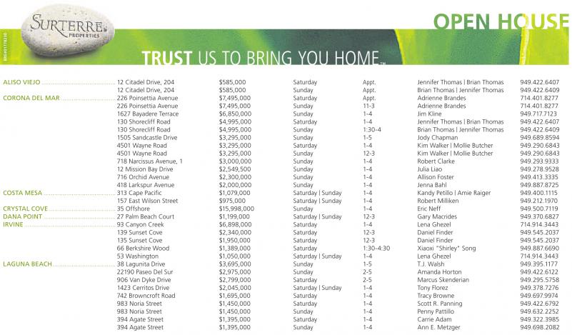ALISO VIEJO .......................................... 12 Citadel Drive, 204 $585,000 Saturday Appt. Jennifer Thomas | Brian Thomas 949.422.6407 12 Citadel Drive, 204 $585,000 Sunday Appt. Brian Thomas | Jennifer Thomas 949.422.6409 CORONA DEL MAR ............................... 226 Poinsettia Avenue $7,495,000 Saturday Appt. Adrienne Brandes 714.401.8277 226 Poinsettia Avenue $7,495,000 Sunday 11-3 Adrienne Brandes 714.401.8277 1627 Bayadere Terrace $6,850,000 Sunday 1-4 Jim Kline 949.717.7123 130 Shorecliff Road $4,995,000 Saturday 1-4 Jennifer Thomas | Brian Thomas 949.422.6407 130 Shorecliff Road $4,995,000 Sunday 1:30-4 Brian Thomas | Jennifer Thomas 949.422.6409 1505 Sandcastle Drive $3,295,000 Sunday 1-5 Jody Chapman 949.689.8594 4501 Wayne Road $3,295,000 Saturday 1-4 Kim Walker | Mollie Butcher 949.290.6843 4501 Wayne Road $3,295,000 Sunday 12-3 Kim Walker | Mollie Butcher 949.290.6843 718 Narcissus Avenue, 1 $3,000,000 Sunday 1-4 Robert Clarke 949.293.9333 12 Mission Bay Drive $2,549,500 Sunday 1-4 Julia Liao 949.278.9528 716 Orchid Avenue $2,300,000 Sunday 1-4 Allison Foster 949.413.3335 418 Larkspur Avenue $2,000,000 Sunday 1-4 Jenna Bahl 949.887.8725 COSTA MESA ......................................... 313 Cape Pacific $1,079,000 Saturday | Sunday 1-4 Kandy Petillo | Amie Raiger 949.400.1115 157 East Wilson Street $975,000 Saturday | Sunday 1-4 Robert Milliken 949.212.1970 CRYSTAL COVE ...................................... 35 Offshore $15,998,000 Sunday 1-4 Eric Neff 949.500.7119 DANA POINT ......................................... 27 Palm Beach Court $1,199,000 Saturday | Sunday 12-3 Gary Macrides 949.370.6827 IRVINE .................................................... 93 Canyon Creek $6,898,000 Saturday 1-4 Lena Ghezel 714.914.3443 139 Sunset Cove $2,340,000 Saturday 12-3 Daniel Finder 949.545.2037 135 Sunset Cove $1,950,000 Saturday 12-3 Daniel Finder 949.545.2037 66 Berkshire Wood $1,389,000 Saturday 1:30-4:30 Xiaoxi "Shirley" Song 949.887.6690 53 Washington $1,050,000 Saturday | Sunday 1-4 Lena Ghezel 714.914.3443 LAGUNA BEACH.................................... 38 Lagunita Drive $3,695,000 Sunday 1-5 T.J. Walsh 949.395.1177 22190 Paseo Del Sur $2,975,000 Sunday 2-5 Amanda Horton 949.422.6122 906 Van Dyke Drive $2,799,000 Saturday 2-5 Marcus Skenderian 949.295.5758 1423 Cerritos Drive $2,045,000 Saturday | Sunday 1-4 Tony Florez 949.378.7276 742 Browncroft Road $1,695,000 Saturday 1-4 Tracy Browne 949.697.9974 983 Noria Street $1,450,000 Saturday 1-4 Scott R. Panning 949.422.6792 983 Noria Street $1,450,000 Sunday 1-4 Penny Pattillo 949.632.2252 394 Agate Street $1,395,000 Saturday 1-4 Carrie Adam 949.322.3985 394 Agate Street $1,395,000 Sunday 1-4 Ann E. Metzger 949.698.2082