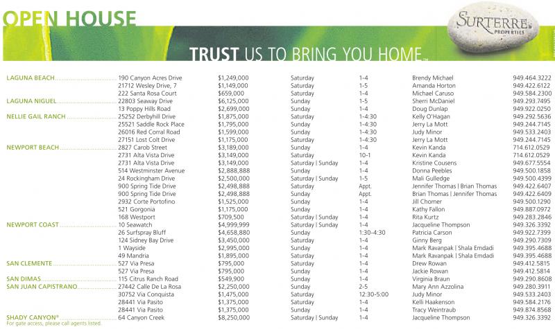 LAGUNA BEACH.................................... 190 Canyon Acres Drive $1,249,000 Saturday 1-4 Brendy Michael 949.464.3222 21712 Wesley Drive, 7 $1,149,000 Saturday 1-5 Amanda Horton 949.422.6122 222 Santa Rosa Court $659,000 Saturday 1-4 Michael Caruso 949.584.2300 LAGUNA NIGUEL................................... 22803 Seaway Drive $6,125,000 Sunday 1-5 Sherri McDaniel 949.293.7495 13 Poppy Hills Road $2,699,000 Sunday 1-4 Doug Dunlap 949.922.0250 NELLIE GAIL RANCH ............................. 25252 Derbyhill Drive $1,875,000 Saturday 1-4:30 Kelly O'Hagan 949.292.5636 25521 Saddle Rock Place $1,795,000 Sunday 1-4:30 Jerry La Mott 949.244.7145 26016 Red Corral Road $1,599,000 Sunday 1-4:30 Judy Minor 949.533.2403 27151 Lost Colt Drive $1,175,000 Saturday 1-4:30 Jerry La Mott 949.244.7145 NEWPORT BEACH ................................. 2827 Carob Street $3,189,000 Sunday 1-4 Kevin Kanda 714.612.0529 2731 Alta Vista Drive $3,149,000 Saturday 10-1 Kevin Kanda 714.612.0529 2731 Alta Vista Drive $3,149,000 Saturday | Sunday 1-4 Kristine Cousens 949.677.5554 514 Westminster Avenue $2,888,888 Sunday 1-4 Donna Peebles 949.500.1858 24 Rockingham Drive $2,500,000 Saturday | Sunday 1-5 Mali Gulledge 949.500.4399 900 Spring Tide Drive $2,498,888 Saturday Appt. Jennifer Thomas | Brian Thomas 949.422.6407 900 Spring Tide Drive $2,498,888 Sunday Appt. Brian Thomas | Jennifer Thomas 949.422.6409 2932 Corte Portofino $1,525,000 Sunday 1-4 Jill Chomer 949.500.1290 521 Gorgonia $1,175,000 Sunday 1-4 Kathy Fallon 949.887.0972 168 Westport $709,500 Saturday | Sunday 1-4 Rita Kurtz 949.283.2846 NEWPORT COAST ................................. 10 Seawatch $4,999,999 Saturday | Sunday 1-4 Jacqueline Thompson 949.326.3392 26 Surfspray Bluff $4,658,880 Sunday 1:30-4:30 Patricia Carson 949.922.7399 124 Sidney Bay Drive $3,450,000 Saturday 1-4 Ginny Berg 949.290.7309 1 Wayside $2,995,000 Sunday 1-4 Mark Ravanpak | Shala Emdadi 949.395.4688 49 Mandria $1,895,000 Saturday 1-4 Mark Ravanpak | Shala Emdadi 949.395.4688 SAN CLEMENTE ..................................... 527 Via Presa $795,000 Saturday 1-4 Drew Rowan 949.412.5815 527 Via Presa $795,000 Sunday 1-4 Jackie Rowan 949.412.5814 SAN DIMAS............................................ 115 Citrus Ranch Road $549,900 Sunday 1-4 Virginia Braun 949.290.8608 SAN JUAN CAPISTRANO....................... 27442 Calle De La Rosa $2,250,000 Sunday 2-5 Mary Ann Azzolina 949.280.3911 30752 Via Conquista $1,475,000 Saturday 12:30-5:00 Judy Minor 949.533.2403 28441 Via Pasito $1,375,000 Saturday 1-4 Kelli Haakenson 949.584.2176 28441 Via Pasito $1,375,000 Sunday 1-4 Tracy Weintraub 949.874.8568 SHADY CANYON ® ................................. 64 Canyon Creek $8,250,000 Saturday | Sunday 1-4 Jacqueline Thompson 949.326.3392 For gate access, please call agents listed.