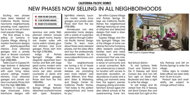 “Our neighborhoods are turning a lot of heads in Irvine and these new releases are prompting even more interest,” said Leslie Stillman, Vice President, Sales & Marketing, and Design Center for California Pacific Homes. “Visit today to the perfect neighborhood and home for you.”