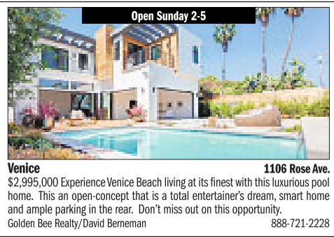 Open Sunday 2-5 Venice 1106 Rose Ave. $2,995,000 ExperienceVenice Beach living at its finest with this luxurious pool home. This an open-concept that is atotal entertainer’sdream, smarthome andample parking in the rear. Don’t miss out on this opportunity. Golden Bee Realty/DavidBerneman 888-721-2228