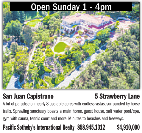 Open Sunday 1 - 4pm SanJuan Capistrano 5Strawberry Lane Abit of paradise on nearly 8use-able acres with endless vistas, surrounded by horse trails. Sprawling sanctuary boasts amain home,guest house,salt water pool/spa, gymwith sauna, tennis courtand more.Minutes to beaches and freeways. PacificSotheby’sInternational Realty 858.945.1312 $4,910,000