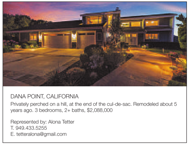DANA POINT, CALIFORNIA Privately perched on ahill, at the end of the cul-de-sac. Remodeled about 5 years ago. 3bedrooms, 2+ baths, $2,088,000