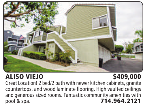 ALISO VIEJO $409,000 Great Location!2bed/2 bath with newerkitchen cabinets,granite countertops,and wood laminate flooring.Highvaulted ceilings andgenerous sizedrooms.Fantastic communityamenities with pool&spa. 714.964.2121