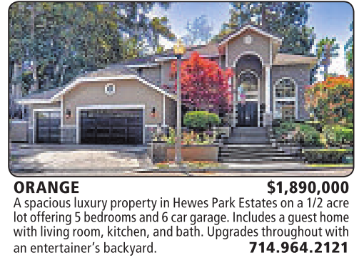 ORANGE $1,890,000 Aspacious luxurypropertyinHewesParkEstates on a1/2 acre lotoffering 5bedrooms and 6car garage. Includes aguest home with living room,kitchen,and bath.Upgrades throughoutwith an entertainer’s backyard. 714.964.2121