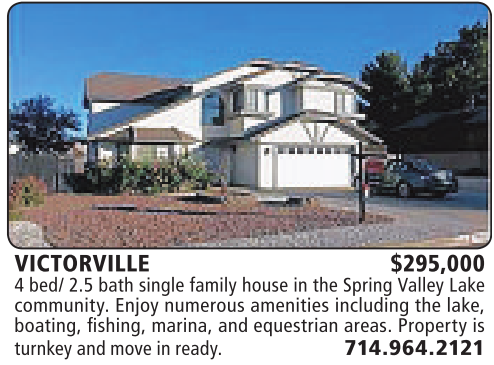 VICTORVILLE $295,000 4bed/ 2.5 bath single family house inthe Spring Valley Lake community. Enjoy numerous amenities including the lake, boating, fishing, marina, and equestrian areas. Property is turnkeyand move in ready. 714.964.2121