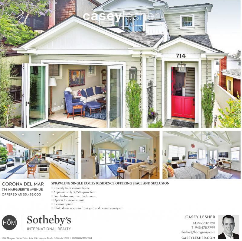 c a s e y l e s h e r CORONA DEL MAR 714 MARGUERITE AVENUE OFFERED AT: $3,495,000 SPRAWLING SINGLE FAMILY RESIDENCE OFFERING SPACE AND SECLUSION • Recently built custom home • Approximately 3,350 square feet • Four bedrooms, three bathrooms • Option for income unit • Elevator option • Bifold doors opens to front yard and central courtyard 1200 Newport Center Drive, Suite 100, Newport Beach, California 92660 | HOMGROUP.COM CASEY LESHER M 949.702.7211 T 949.478.7799 clesher@homgroup.com CASEYLESHER.COM See also