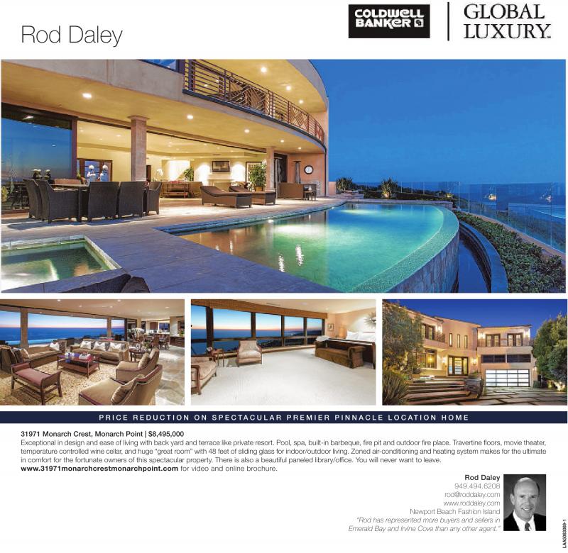 Rod Daley P R I C E R E D U C T I O N O N S P E C TA C U L A R P R E M I E R P I N N A C L E L O C AT I O N H O M E 31971 Monarch Crest, Monarch Point | $8,495,000 Exceptional in design and ease of living with back yard and terrace like private resort. Pool, spa, built-in barbeque, fire pit and outdoor fire place. Travertine floors, movie theater, temperature controlled wine cellar, and huge “great room” with 48 feet of sliding glass for indoor/outdoor living. Zoned air-conditioning and heating system makes for the ultimate in comfort for the fortunate owners of this spectacular property. There is also a beautiful paneled library/office. You will never want to leave. www.31971monarchcrestmonarchpoint.com for video and online brochure. Rod Daley 949.494.6208 rod@roddaley.com www.roddaley.com Newport Beach Fashion Island “Rod has represented more buyers and sellers in Emerald Bay and Irvine Cove than any other agent.” See also