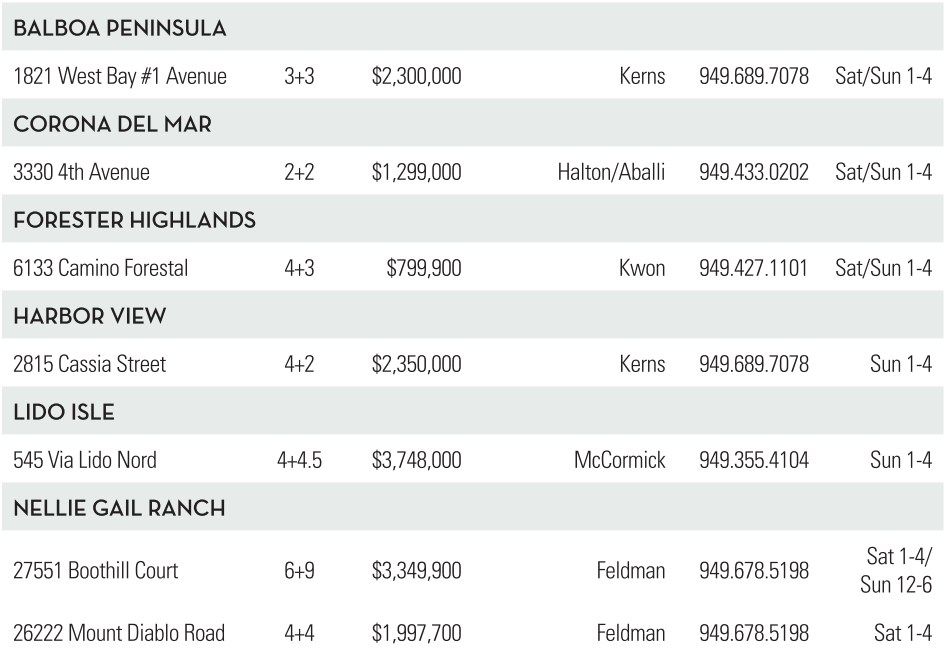 BALBOAPENINSULA 1821 West Bay #1 Avenue 3+3 $2,300,000 Kerns 949.689.7078 Sat/Sun 1-4 CORONA DEL MAR 3330 4th Avenue 2+2 $1,299,000 Halton/Aballi 949.433.0202 Sat/Sun 1-4 FORESTER HIGHLANDS 6133 Camino Forestal 4+3 $799,900 Kwon 949.427.1101 Sat/Sun 1-4 HARBOR VIEW 2815 Cassia Street 4+2 $2,350,000 Kerns 949.689.7078 Sun 1-4 LIDO ISLE 545 ViaLido Nord 4+4.5 $3,748,000 McCormick 949.355.4104 Sun 1-4 NELLIE GAIL RANCH 27551 Boothill Court 6+9 $3,349,900 Feldman 949.678.5198 Sat 1-4/ Sun 12-6 26222 Mount Diablo Road 4+4 $1,997,700 Feldman 949.678.5198 Sat 1-4