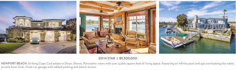 NEWPORT BEACH: Striking Cape Cod estate in Dover Shores. Panoramic views with over 5,500 square feet of living space. Featuring an Infinity pool and spa overlooking the water, private boat dock, three car garage with added parking and beach access.