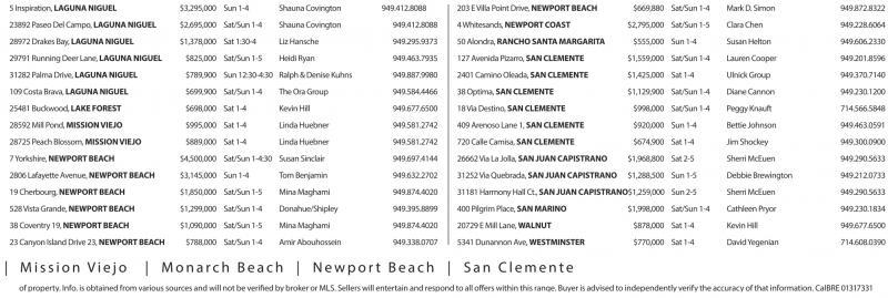 28592 Mill Pond, MISSION VIEJO $995,000 Sat 1-4 Linda Huebner 949.581.2742