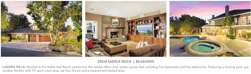 LAGUNA HILLS: Nestled in the Nellie Gail Ranch community this estate offers over 5,000 square feet including five bedrooms and five bathrooms. Featuring a hosting pool, spa, outdoor kitchen with TV, sport court area, zip line, fire pit and a covered and heated lanai.