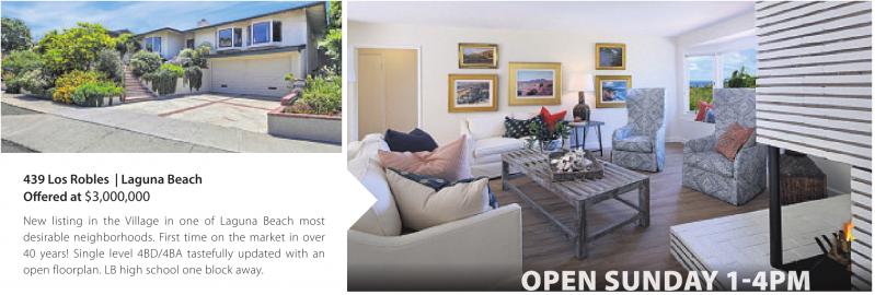 439 Los Robles | Laguna Beach Offered at $3,000,000 New listing in the Village in one of Laguna Beach most desirable neighborhoods. First time on the market in over 40 years! Single level 4BD/4BA tastefully updated with an open floorplan. LB high school one block away. OPEN SUNDAY 1-4PM